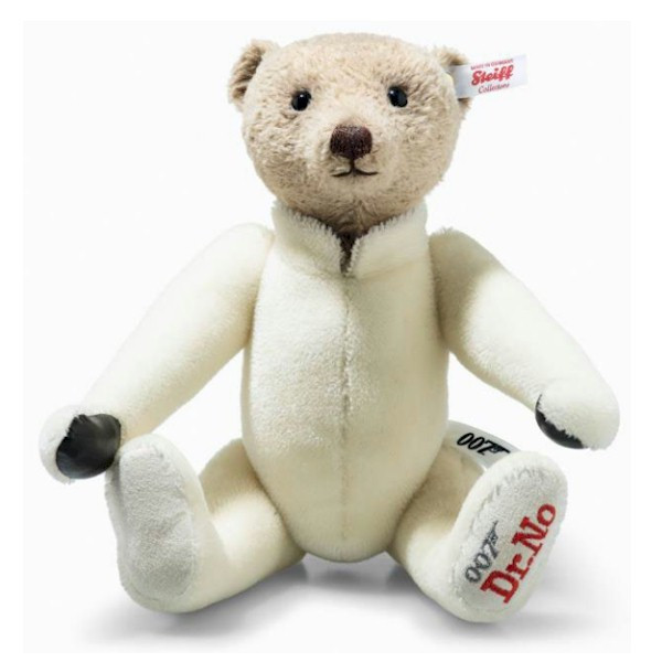 James Bond villain Dr. Julius No Teddy bear, is 5-way jointed, made out of beige/white colored mohair and is limited to 1962 pieces.