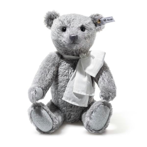 Steiff Club edition 2026 Teddy bear, is 5-way jointed, made from a gray colored and is limited to 687 pieces.