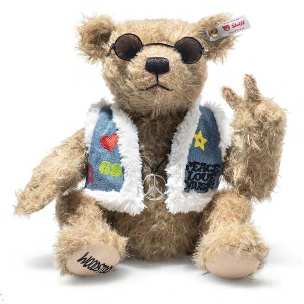 Steiff Rocks Woodstock Teddy bear, 5-way jointed, made from a shaggy brown colored mohair and is limited to 969 pieces.